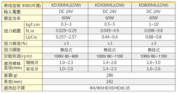 * 型號英文字母說明:KD: 公司產品代號,M: 無碳馬達,L: 手按式啟動,S: 快速,LOW: 慢速,