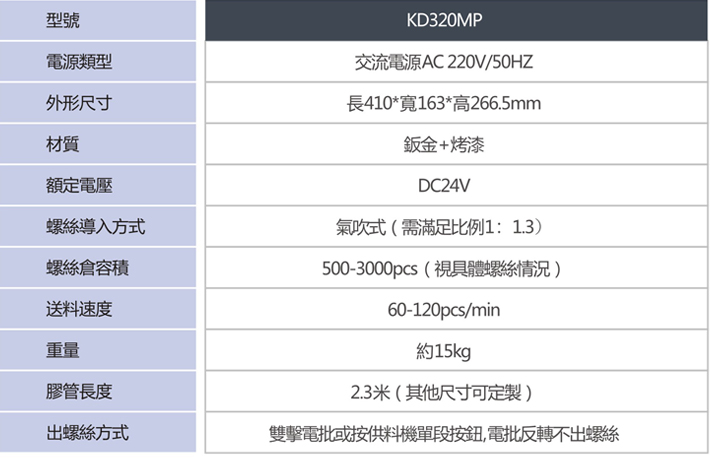 全自動送料器1臺、導料管1條、手持組件一套(含電批、夾嘴(夾嘴根據螺絲不同而不同)、氣缸等,手持才包含此項)、操作說明1PCS